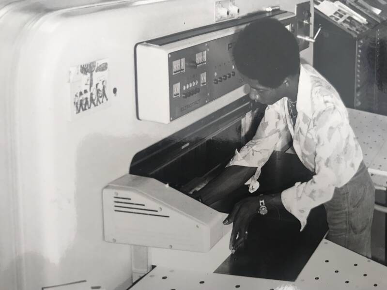 Hij moet platen snijden in de juiste afmeting. Het ziet er moeilijk uit maar het is een simpele klus. Hij luistert aandachtig naar de uitleg van Meneer Visser en na samen enkele platen te hebben gesneden is hij er klaar voor om de taak verder alleen op zich te nemen.